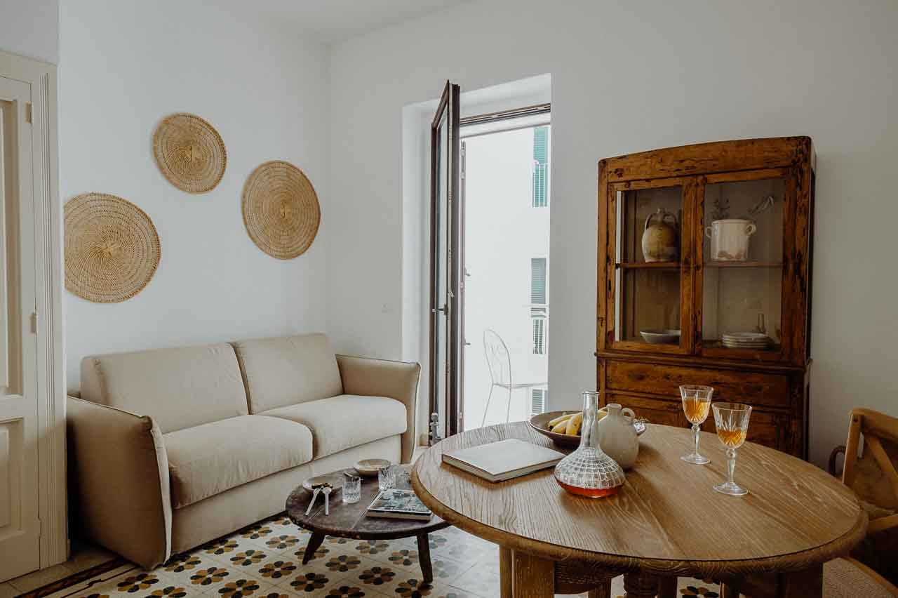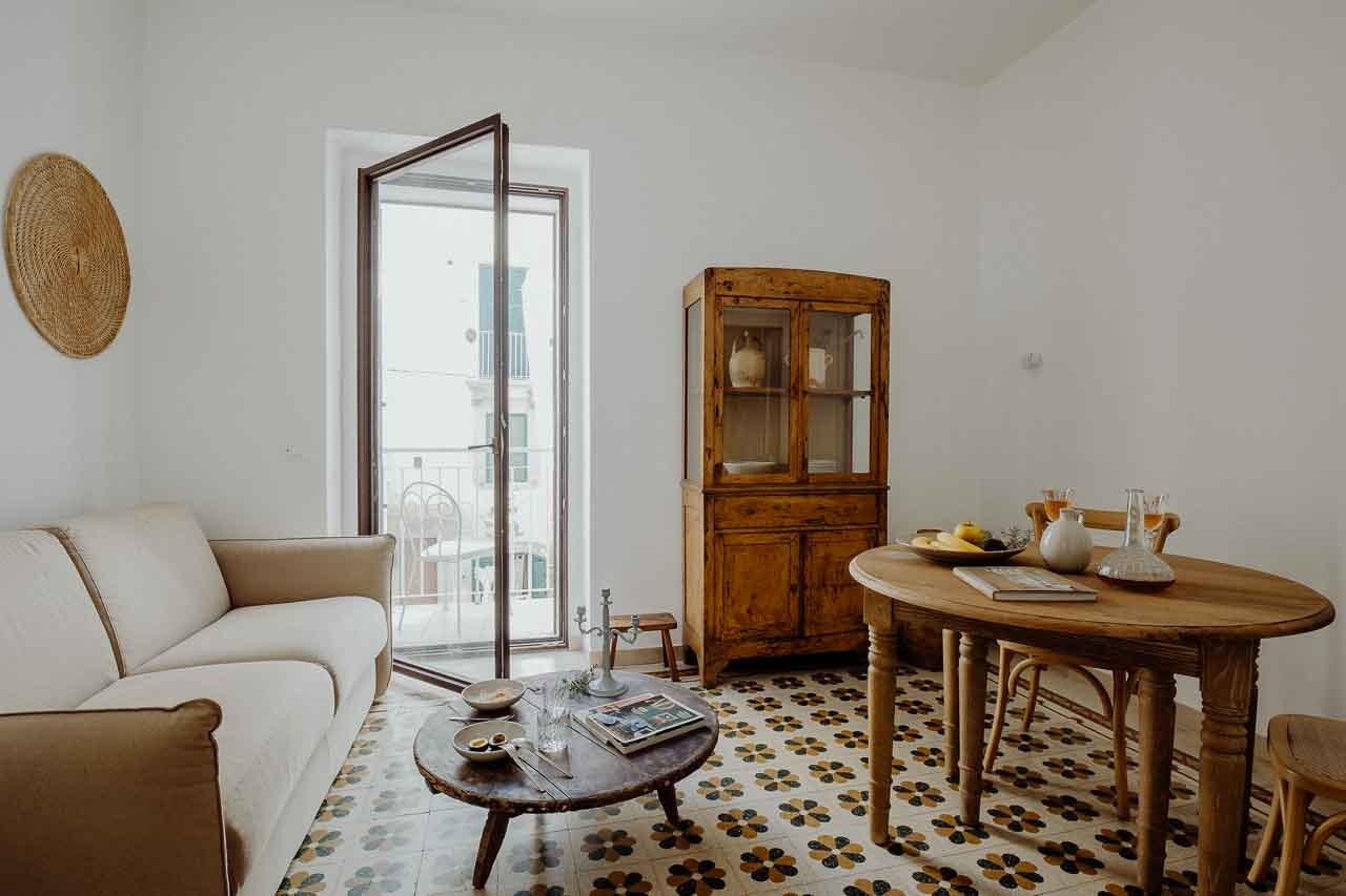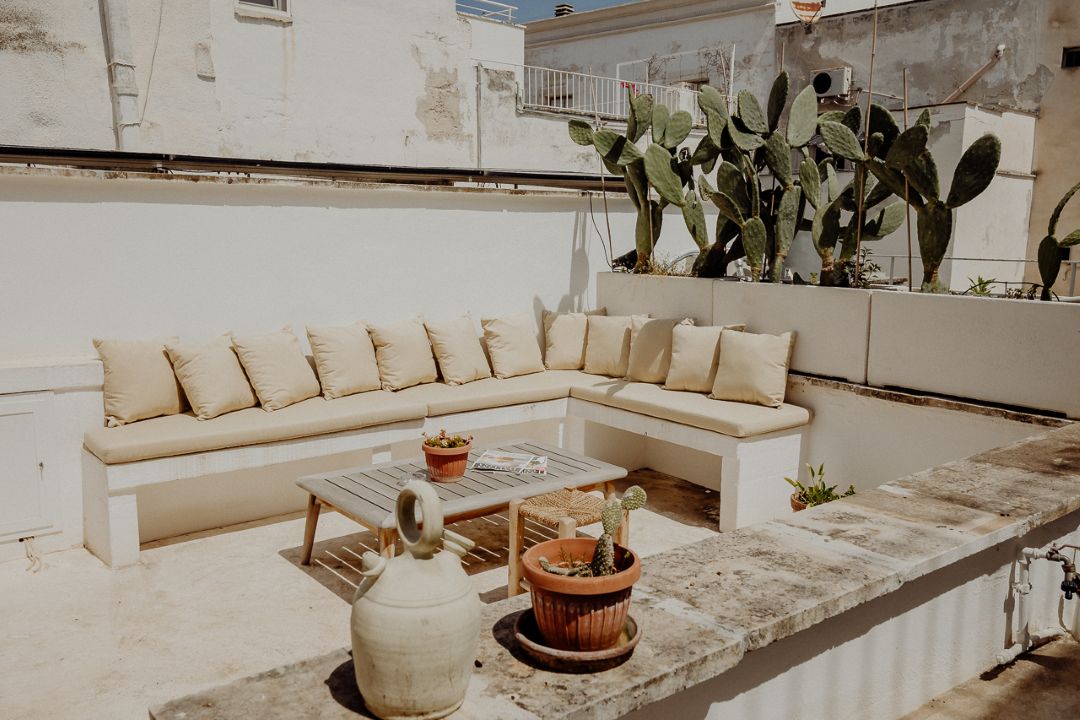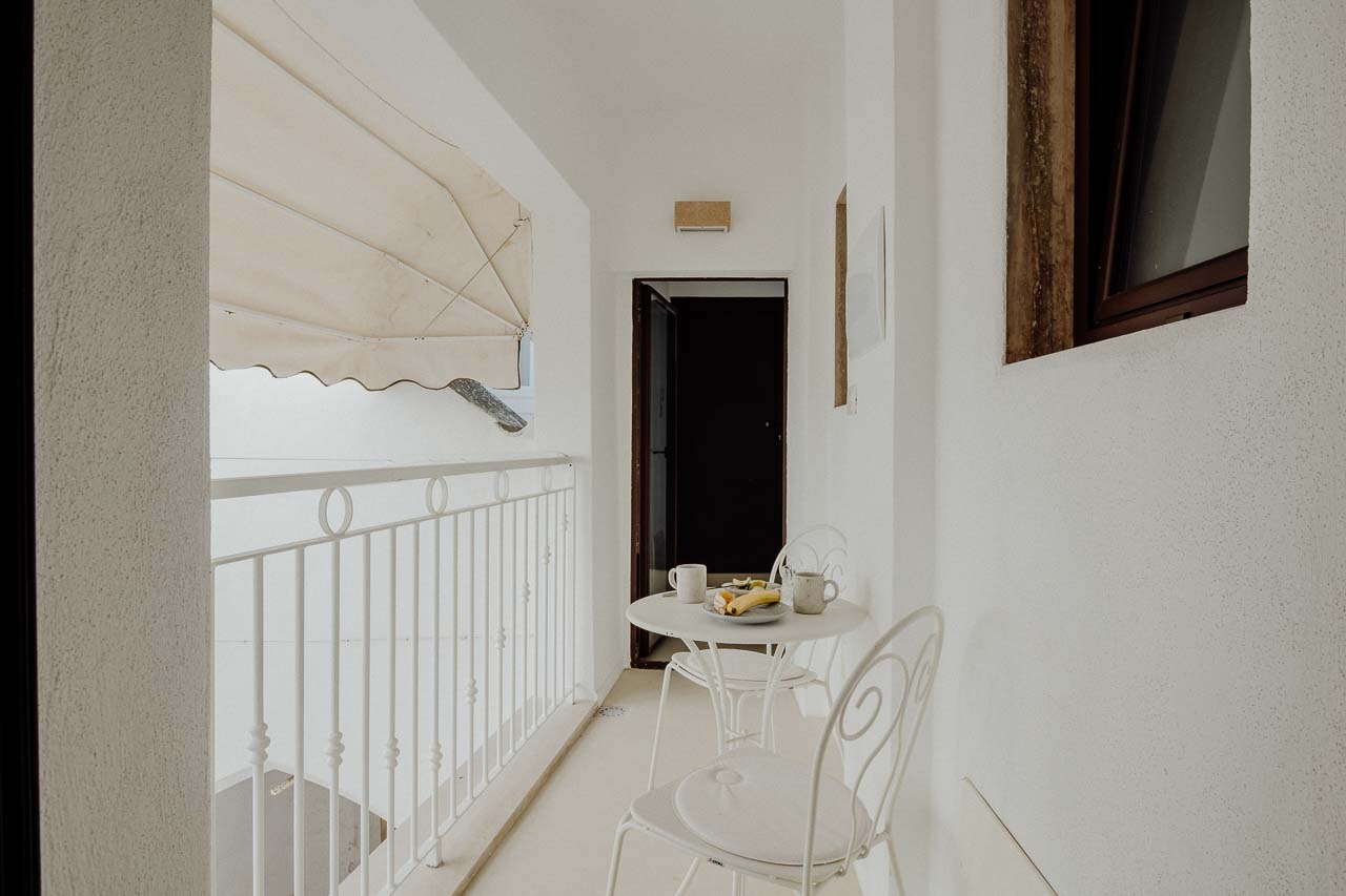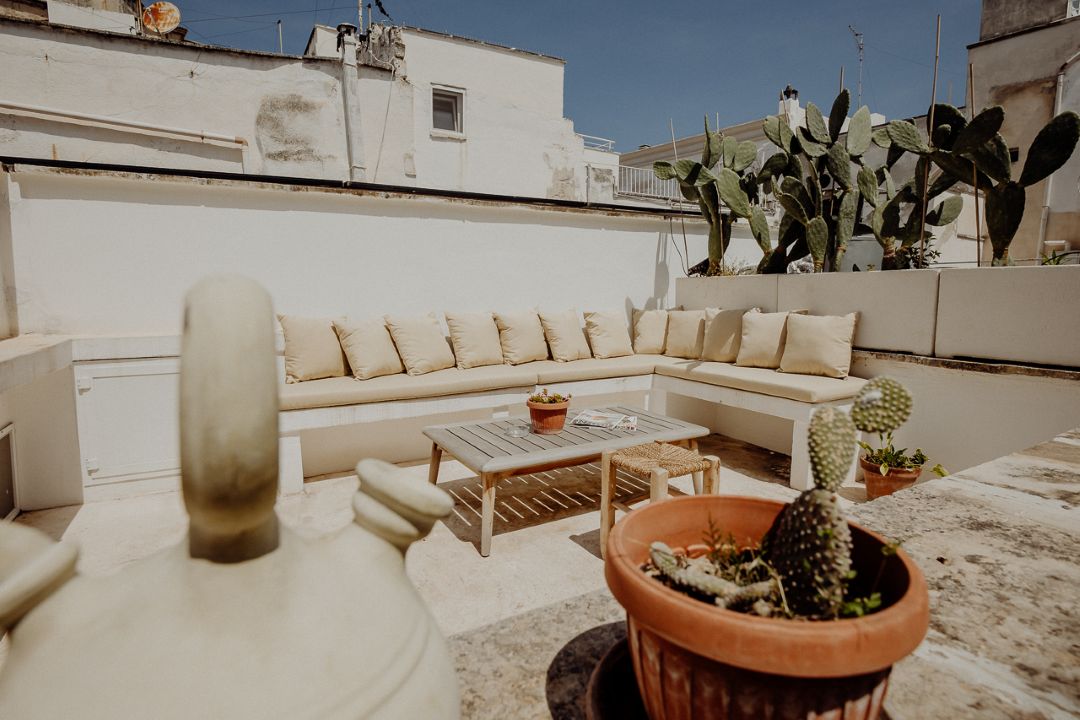 La cucina, completamente attrezzata e impreziosita dall’affaccio su uno dei due balconcini, rende piacevole e funzionale la preparazione dei pasti. La spaziosa terrazza indipendente, arredata con gusto, regala una vista suggestiva sui tetti di Monopoli, ideale per pranzi e cene all’aperto. Pavimenti in microcemento e l’impiego di materiali naturali creano un’atmosfera raffinata e moderna, in armonia con la tradizione locale.