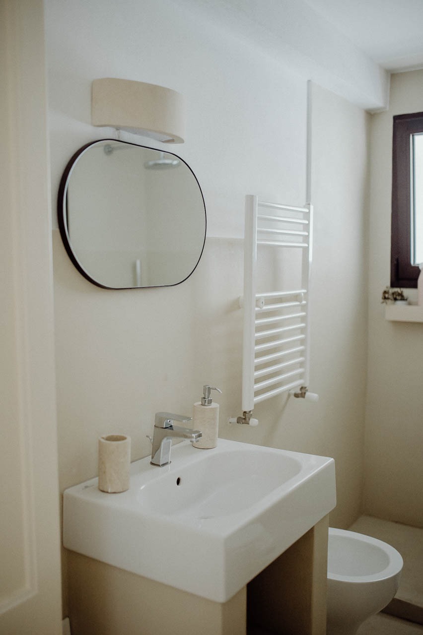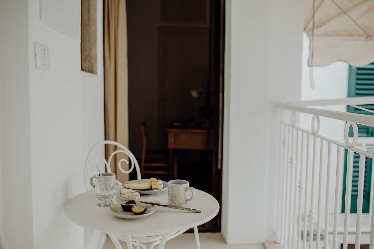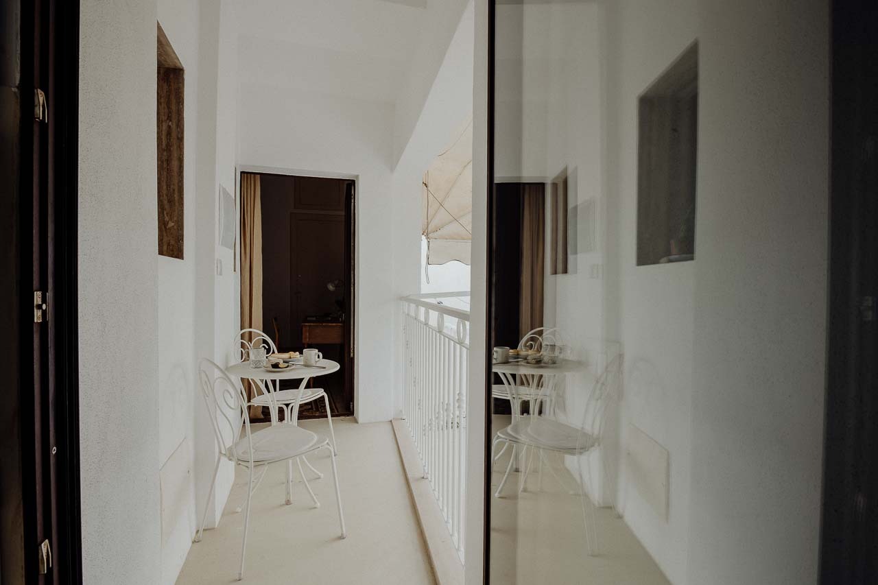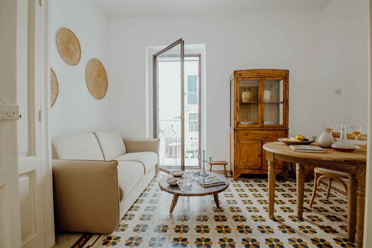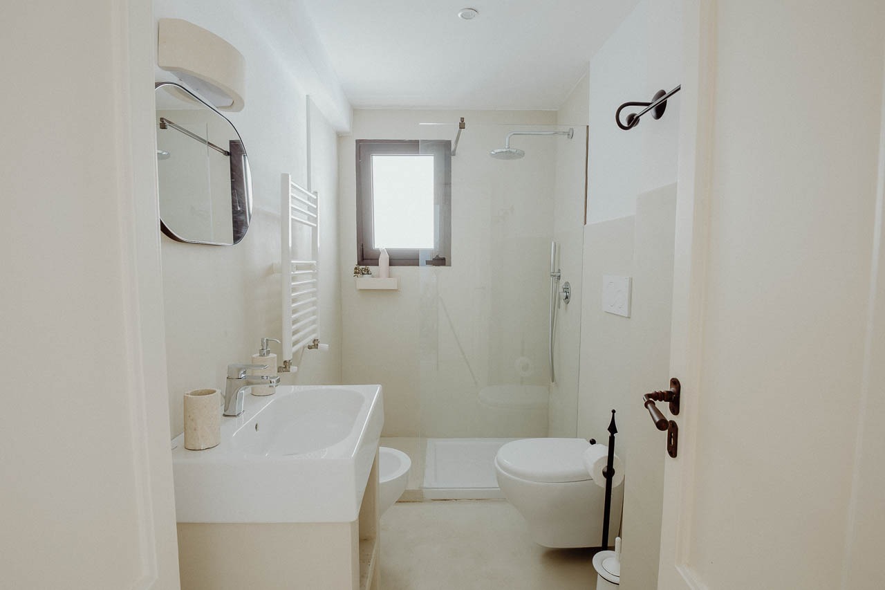 La cucina, completamente attrezzata e impreziosita dall’affaccio su uno dei due balconcini, rende piacevole e funzionale la preparazione dei pasti. La spaziosa terrazza indipendente, arredata con gusto, regala una vista suggestiva sui tetti di Monopoli, ideale per pranzi e cene all’aperto. Pavimenti in microcemento e l’impiego di materiali naturali creano un’atmosfera raffinata e moderna, in armonia con la tradizione locale.